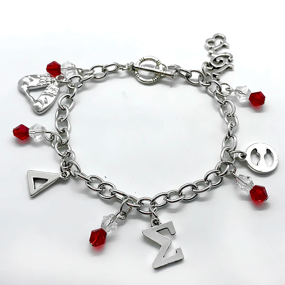 Introducing the Delta Sigma Theta Charm Bracelet, a dazzling tribute to the illustrious sisterhood. This exquisite piece features a delicate silver chain adorned with meticulously crafted charms, showcasing the iconic symbols of Delta Sigma Theta Sorority, Inc. Each charm represents the pillars of scholarship, sisterhood, and service, embodying the values cherished by members. With its elegant design and impeccable craftsmanship, this charm bracelet serves as a timeless symbol of pride and unity for Delta Sigma Theta sisters around the world. Wear it with grace and honor, celebrating the rich legacy of this esteemed sisterhood.
